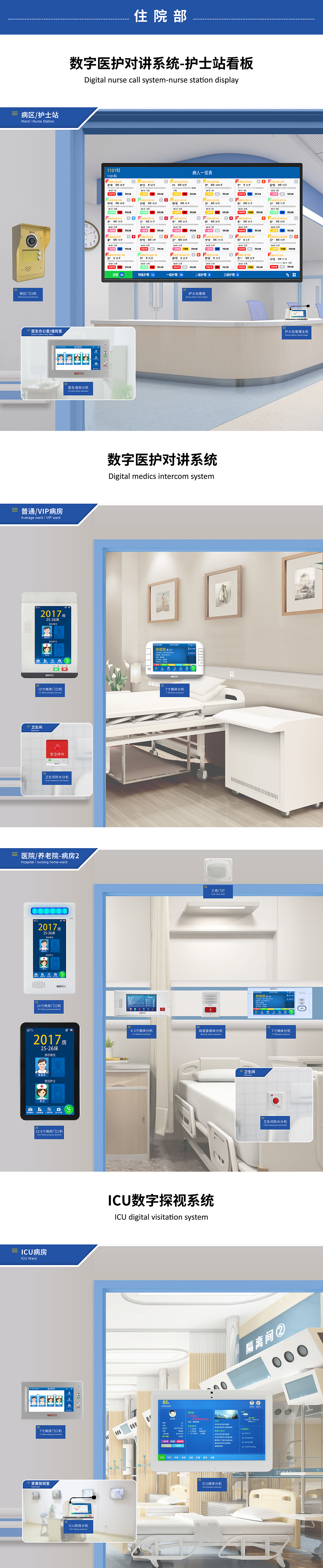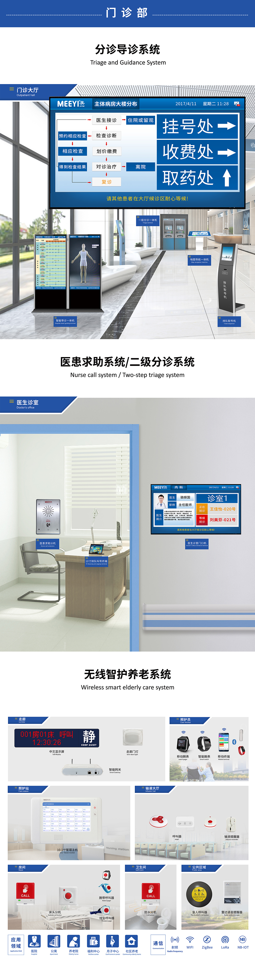 環(huán)宇通旗下MEEYI美一智慧醫(yī)養(yǎng)系統(tǒng),包括了醫(yī)護(hù)對(duì)講、病房視訊、ICU探視、床旁交互、分診排隊(duì)、取藥叫號(hào)、信息發(fā)布、醫(yī)患求助等系統(tǒng);最新研制的E6智慧醫(yī)養(yǎng)系統(tǒng),結(jié)合了前沿的物聯(lián)網(wǎng)、大數(shù)據(jù)、人工智能、無(wú)線通訊等新技術(shù),現(xiàn)實(shí)了醫(yī)護(hù)設(shè)備的智能化升級(jí),可有效提高醫(yī)療服務(wù)質(zhì)量,推動(dòng)智慧醫(yī)院建設(shè)。
