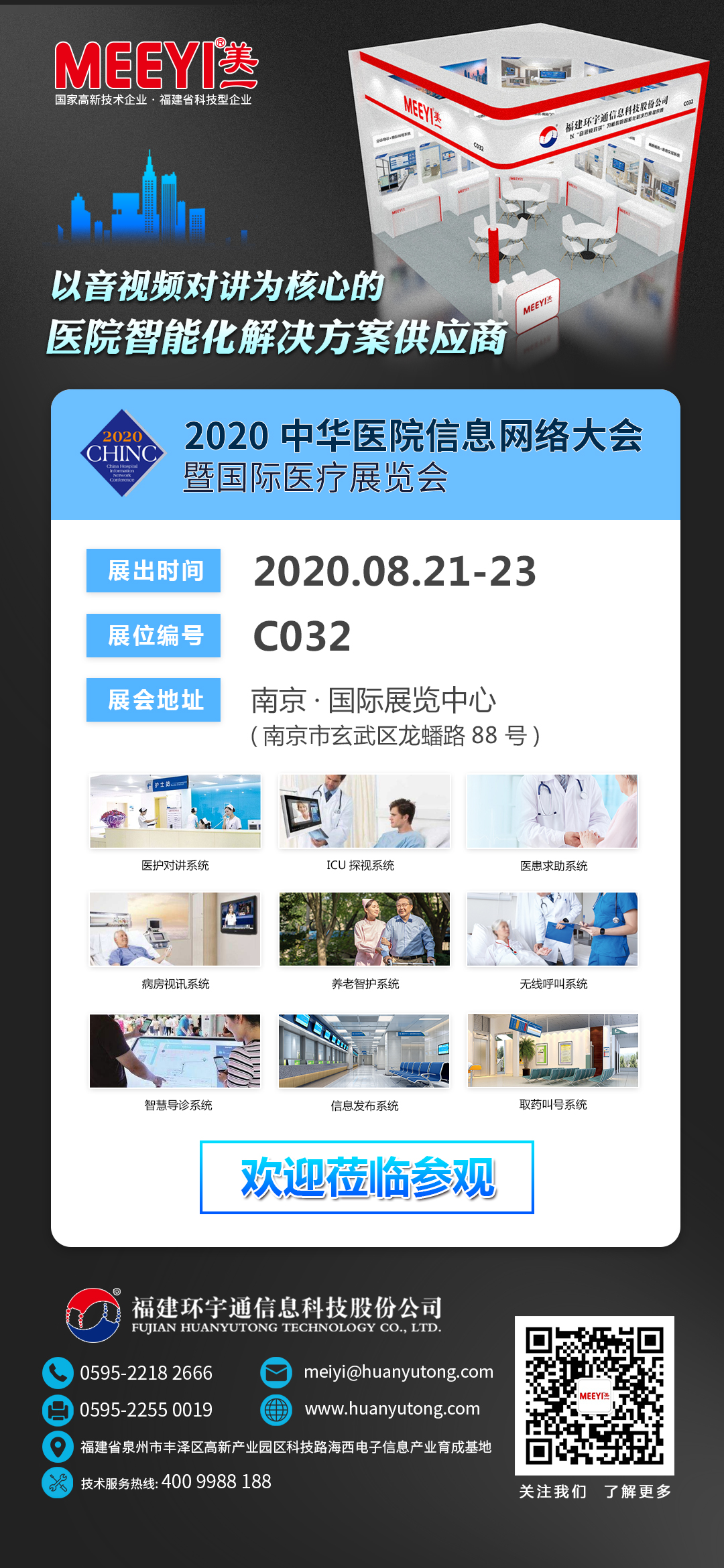2020年8月21日,福建環(huán)宇通信息科技股份公司旗下品牌MEEYI美一將在南京國(guó)際展覽中心舉辦的中華醫(yī)院信息網(wǎng)絡(luò)大會(huì)暨中國(guó)醫(yī)療信息技術(shù)展覽上亮相。