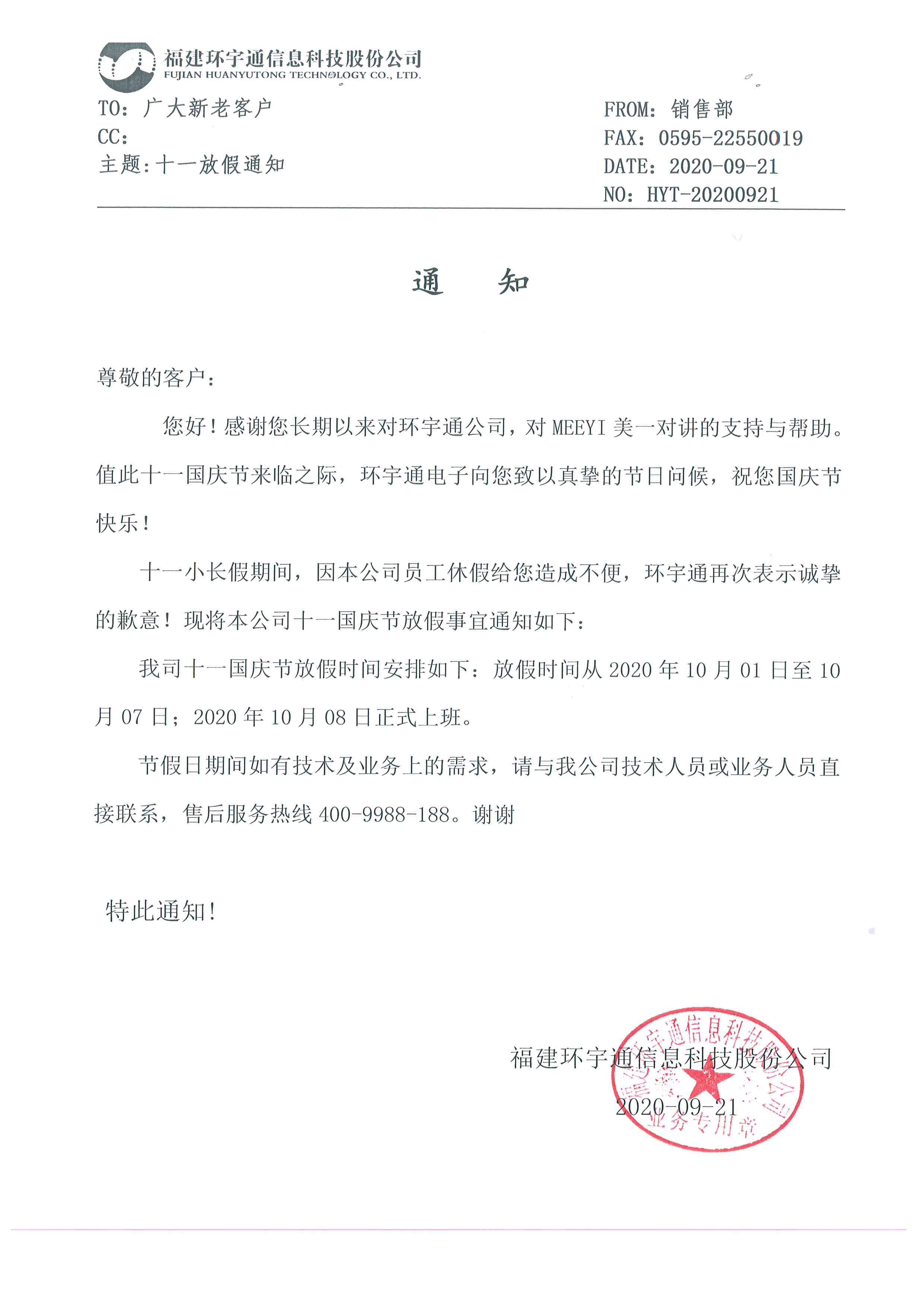 環(huán)宇通10月1日放假通知