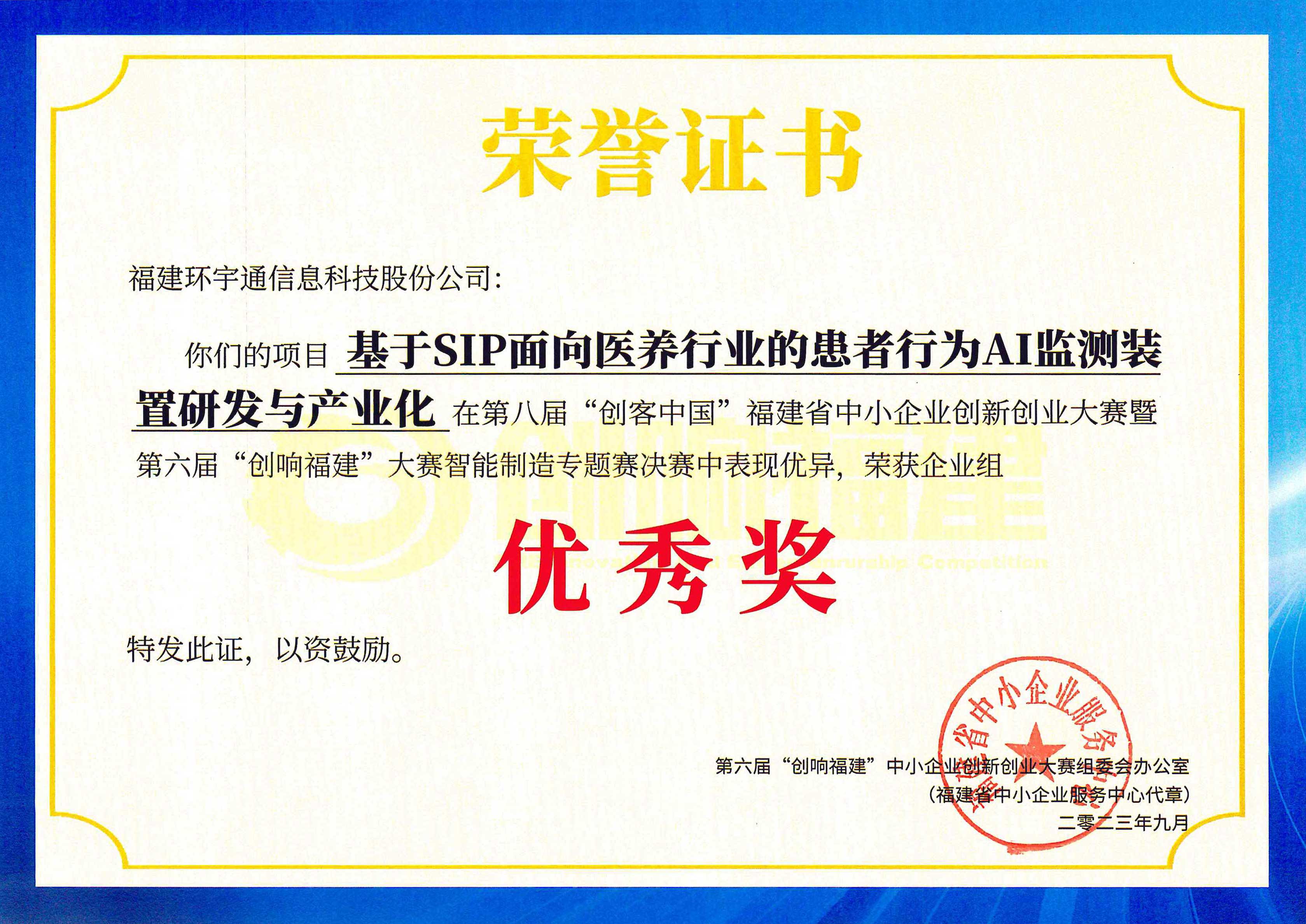 我司自主研發(fā)的“基于SIP面向醫(yī)養(yǎng)行業(yè)的患者監(jiān)測AI檢測裝置研發(fā)與產(chǎn)業(yè)化”高新項目,參加第六屆“創(chuàng)響福建”中小企業(yè)創(chuàng)新創(chuàng)業(yè)大賽暨第六屆“創(chuàng)響福建”大賽智能制造專題賽榮獲省級優(yōu)秀獎。