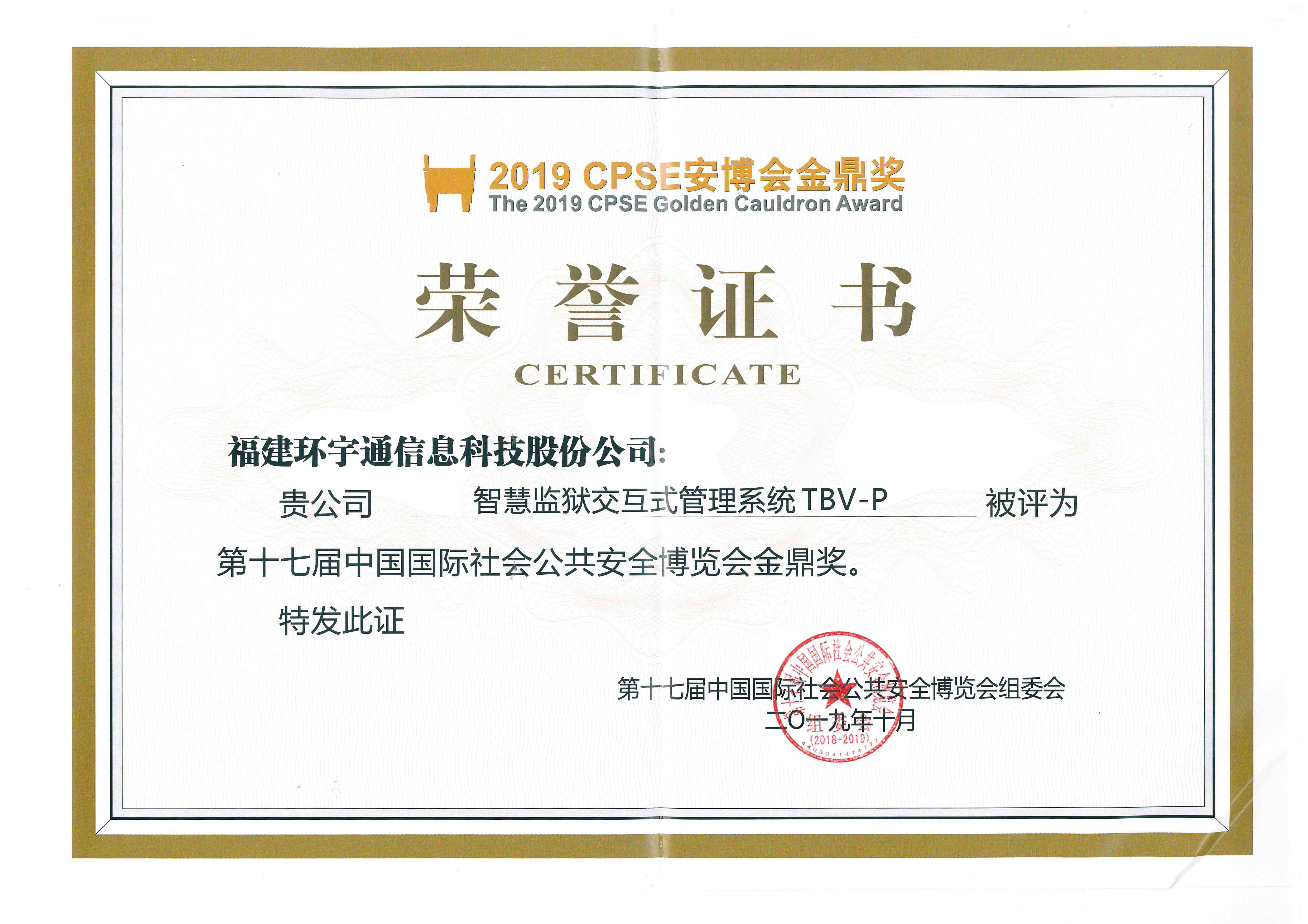 2019CPSE安博會(huì)金鼎獎(jiǎng)證書(shū)